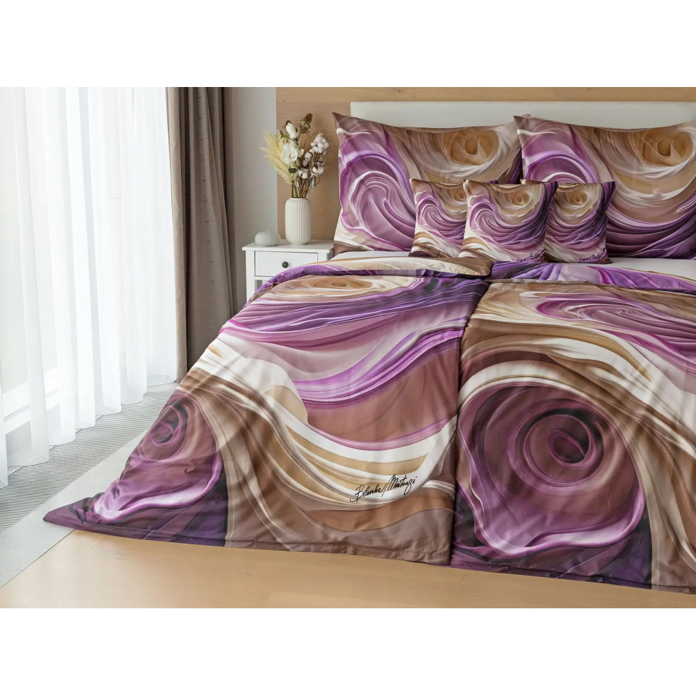 Tento autorský digitálně zpracovaný motiv harmonicky spojuje zářivé odstíny fialové s paletou krémových a béžových tónů. Nejmodernější digitální tisk zajišťuje věrný detail přesně dle autorčina záměru, motiv je z obou stran povlečení stejný.