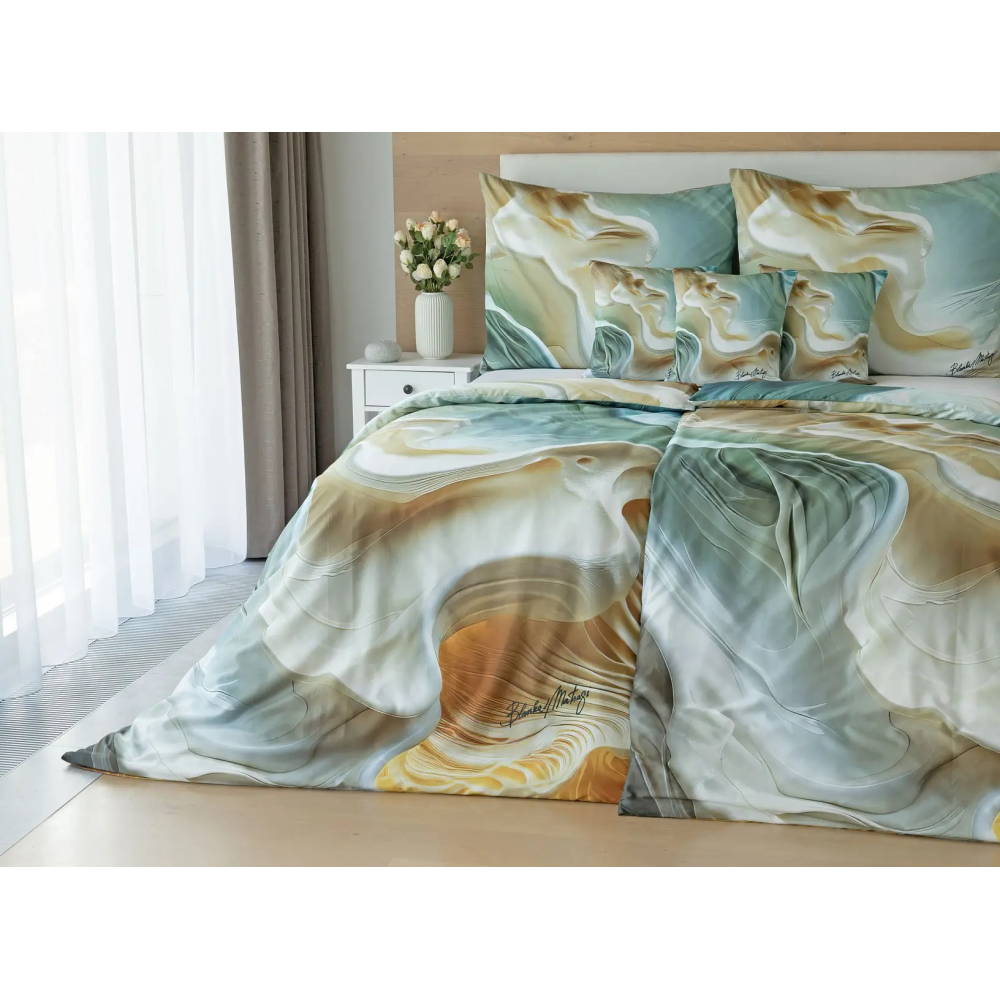 V tomto autorském digitálně zpracovaném motivu se harmonicky prolínají krémové, béžové a mátově zelené odstíny, zvýrazněné zářivým jantarovým tónem. Nejmodernější digitální tisk zajišťuje věrný detail přesně dle autorčina záměru, motiv je z obou stran povlečení stejný.