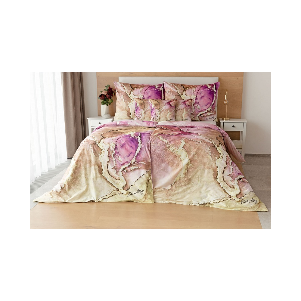 Poutavý abstraktní vzor povlečení Pramen přímo vyzařuje energického ducha věhlasné návrhářky. Autorský digitálně zpracovaný motiv v sobě snoubí hřejivé odstíny přírodní béžové se zářivou paletou růžovo-fialových tónů. Oblékněte svou ložnici ve stylu vytříbené elegance. Propracované detaily činí z tohoto luxusního povlečení osobité umělecké dílo.