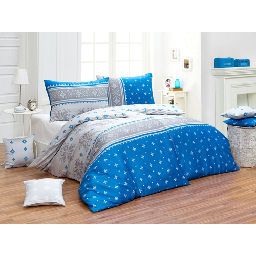 Nechte se okouzlit tradičně až svátečně vyhlížejícím motivem v ledových odstínech modré a šedé, které přináší povlečení KIRA. Povlak na přikrývku je z každé strany jiný (spodní stranu tvoří jednoduchý geometrický motiv, bez pruhů), polštář 70/90 cm je z každé strany jiný (odpovídá vyobrazení na fotografii). Povlečení je opatřeno komfortním zipovým uzávěrem.