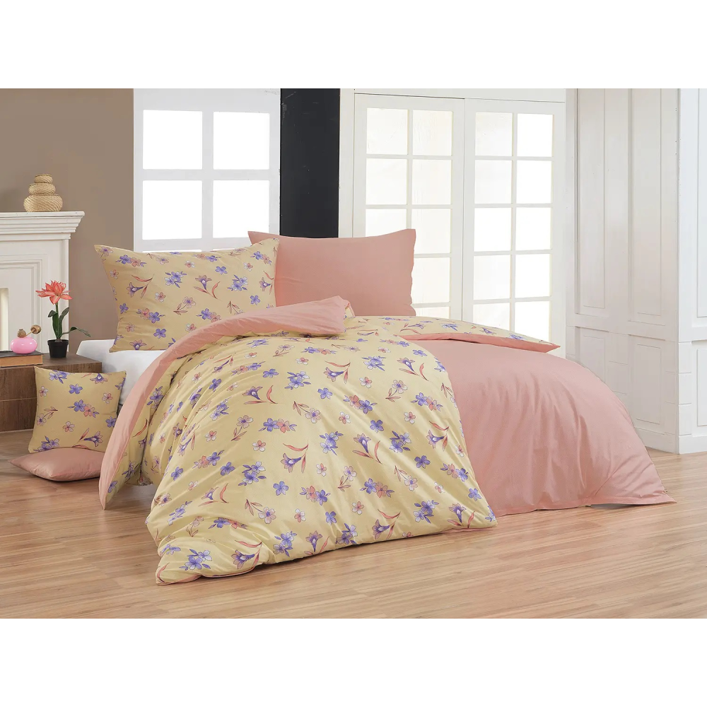 Bavlněné ložní povlečení Elia vnese do vaší ložnice svěžest a pozitivní atmosféru. Jemné kvítky v paletě fialových a růžových tónů na žlutém podkladu zdobí vrchní stranu povlečení. Spodní strana nabízí příjemný kontrast v podobě drobných bílých puntíků na růžovém podkladu.