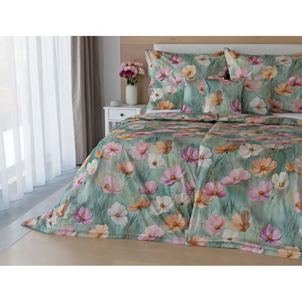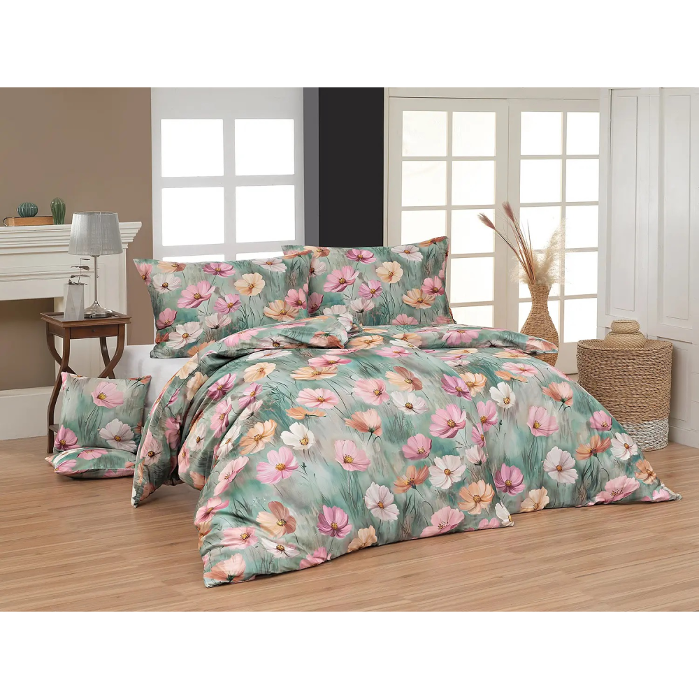 Vneste do svého interiéru svěžest jarní louky. Elegantní povlečení Azuel s jemným květinovým motivem v růžových, pudrových a meruňkových tónech na uklidňujícím zelenomodrém podkladu promění každou ložnici v harmonické místo plné klidu a pohody. Tento akvarelově laděný motiv je ideální volbou pro milovníky přírodního stylu, světlých interiérů a ženské elegance. Skvěle se hodí do moderních i klasických ložnic.