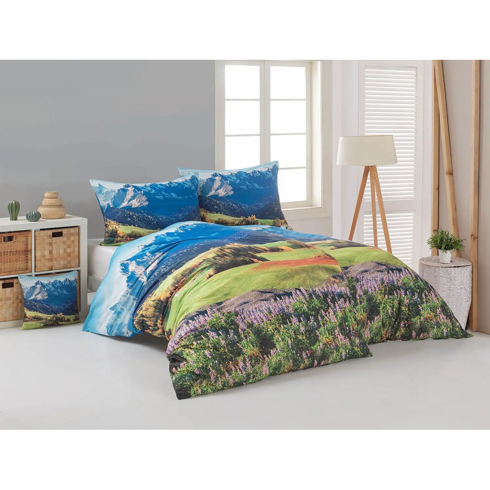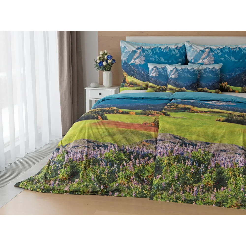 Ložní povlečení Hory s panoramatickým motivem horské krajiny vnese do vaší ložnice pocit svobody, klidu a propojení s přírodou. Rozkvetlé louky, zelené svahy a majestátní horské štíty vytvářejí harmonickou scenérii. Syté barvy a detailní tisk dodávají povlečení přirozený charakter, díky kterému se stane dominantou interiéru. Ideální volba pro milovníky přírody, hor a cestování. Dopřejte si každý večer pocit, jako byste usínali uprostřed rozkvetlé horské krajiny.