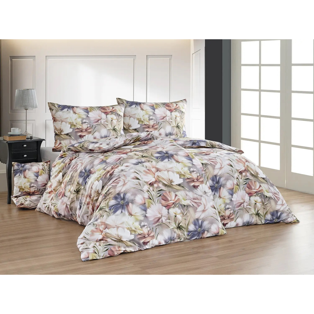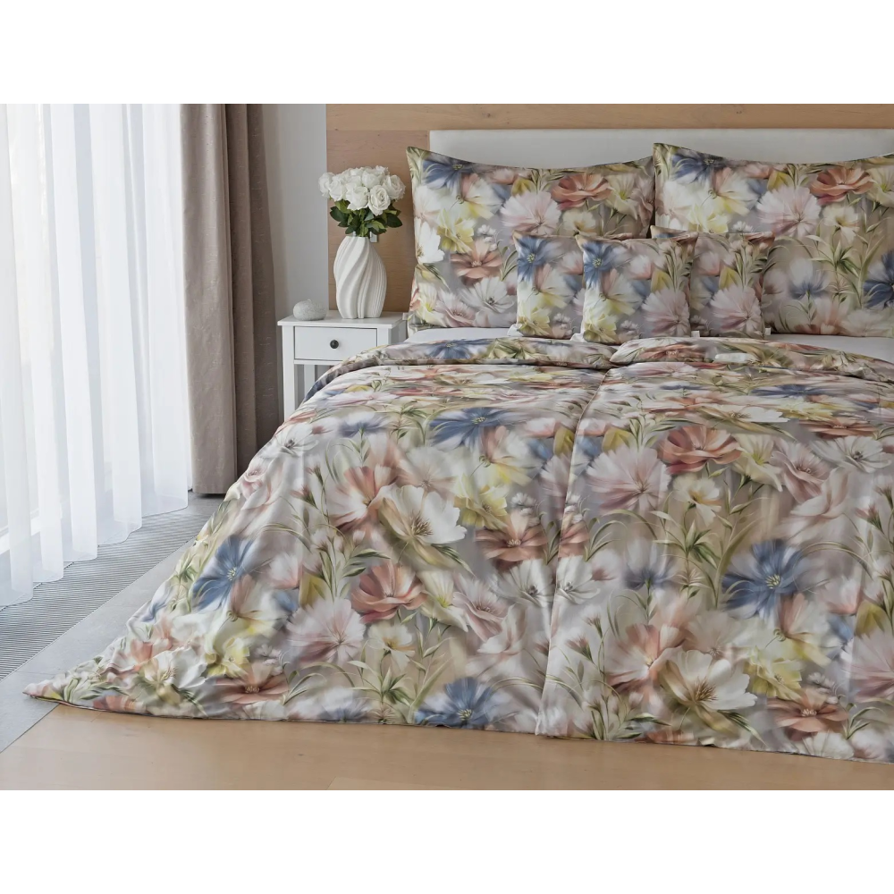Tento romantický florální vzor přináší bohatou kompozici pestrých květů, které díky jemným barevným přechodům přirozeně splývají s podkladem a vytvářejí tak harmonický celek. Kombinace bílých, pudrových a modrých tónů působí svěže, vzdušně a velmi elegantně. Povlak na polštář i na přikrývku je z obou stran stejný, vrchní stranu povlaku na polštář zdobí malé logo "M" v pravém dolním rohu. Povlečení je opatřeno komfortním zipovým uzávěrem.