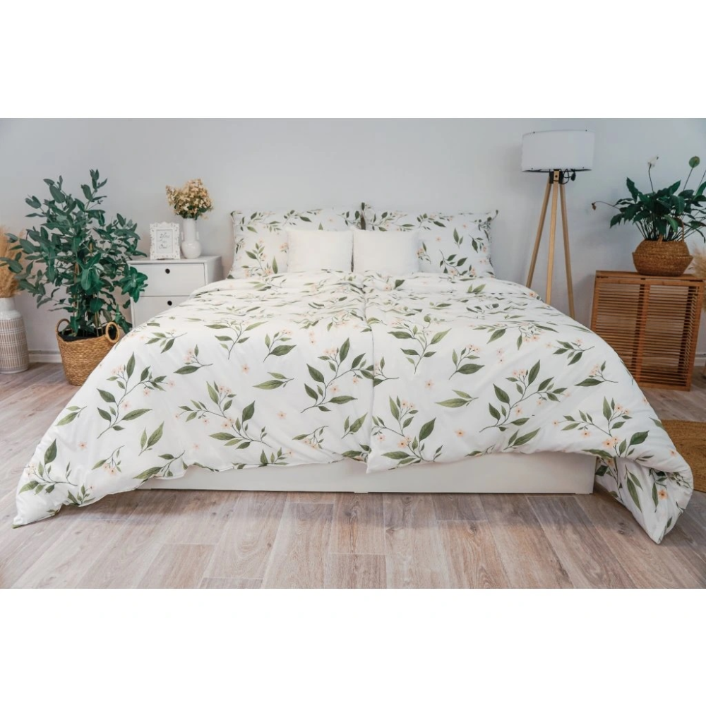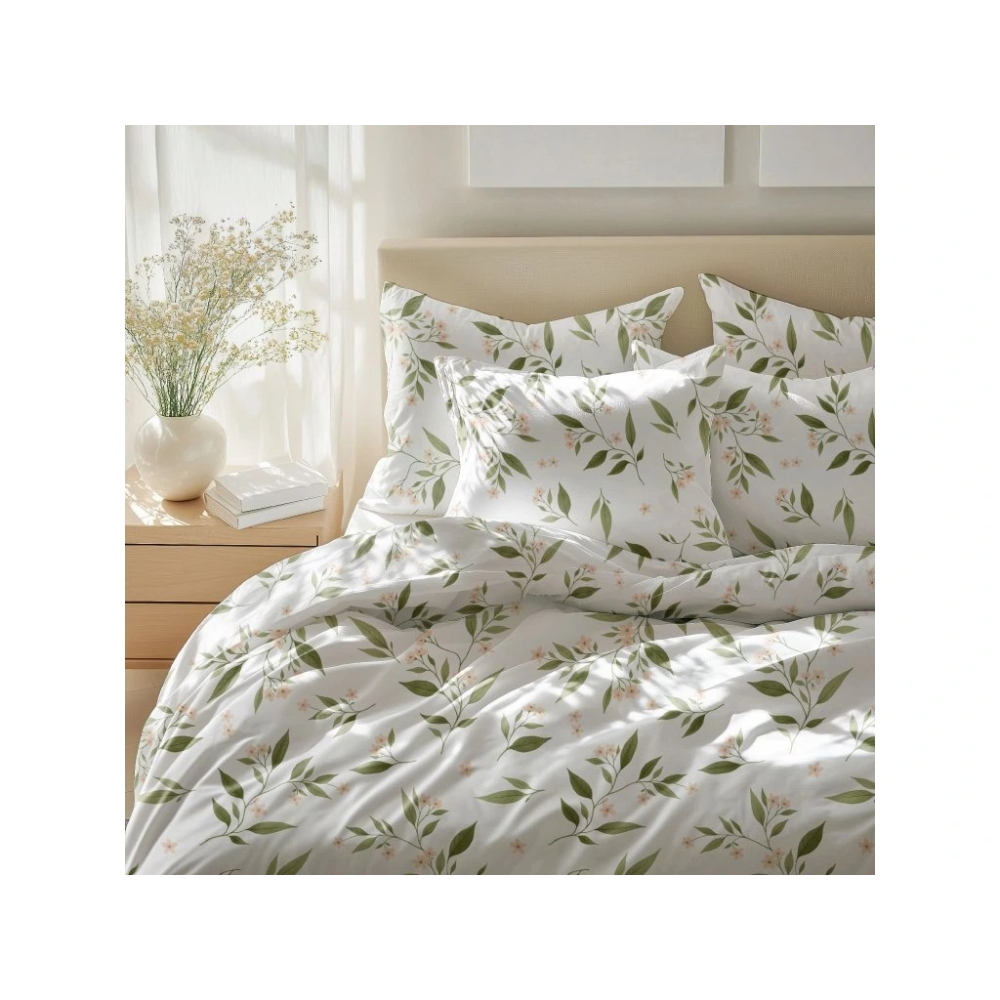Vneste do své ložnice svěžest a klid přírody. Toto kvalitní krepové povlečení s jemným vzorem zelených lístků a drobných růžových kvítků dodá interiéru nadčasový, elegantní styl. Materiál ze 100% bavlny je prodyšný a snadno se udržuje a nežehlí se. Zapínání na knoflíky je praktické a tradiční, zajišťuje pevné uchycení přikrývky.
