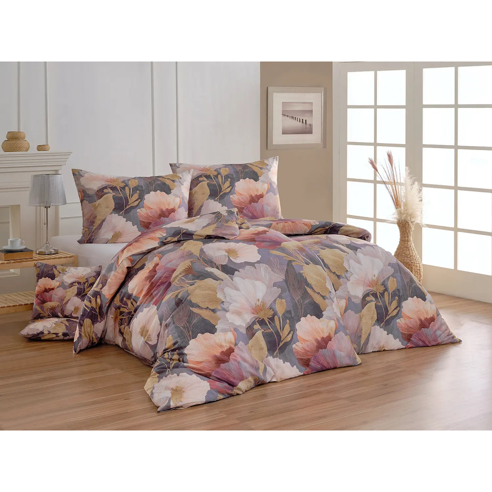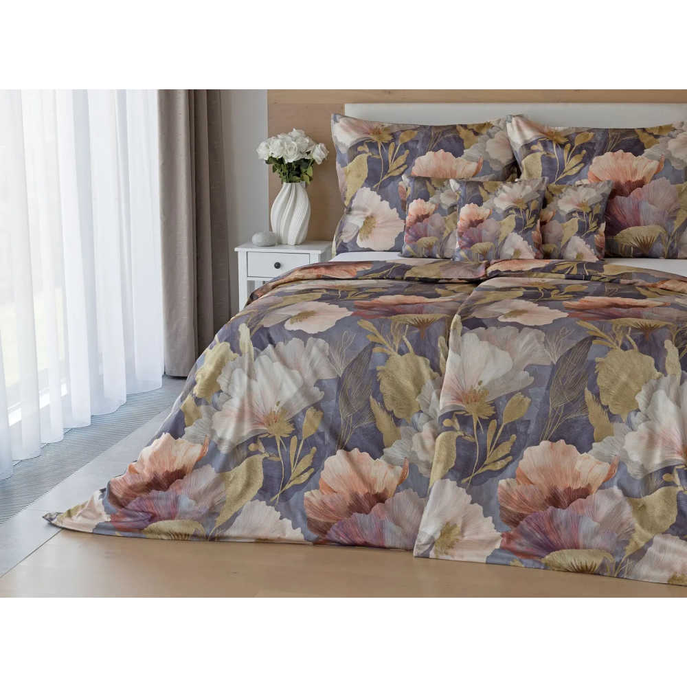 Ložní povlečení Veneto zdobí výrazný květinový motiv s tlumeným podkladem v šedo-fialových tónech. Velkoryse pojaté abstraktní květy v paletě pudrových, meruňkových, korálových a fialových tónů doplňují zlatavé prvky, které podtrhují elegantní vzhled tohoto originálního vzoru. Decentní lesk bavlněného saténu je poslední tečkou k dokonalosti tohoto povlečení.
