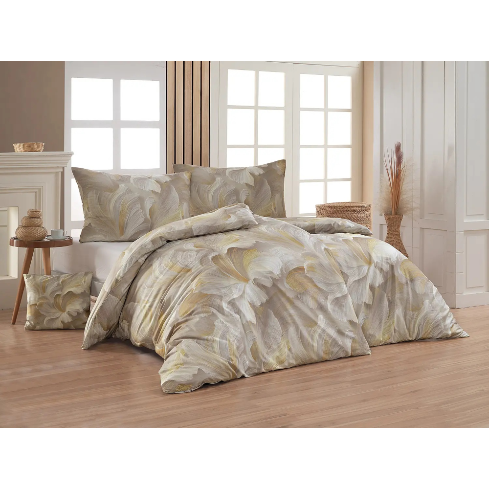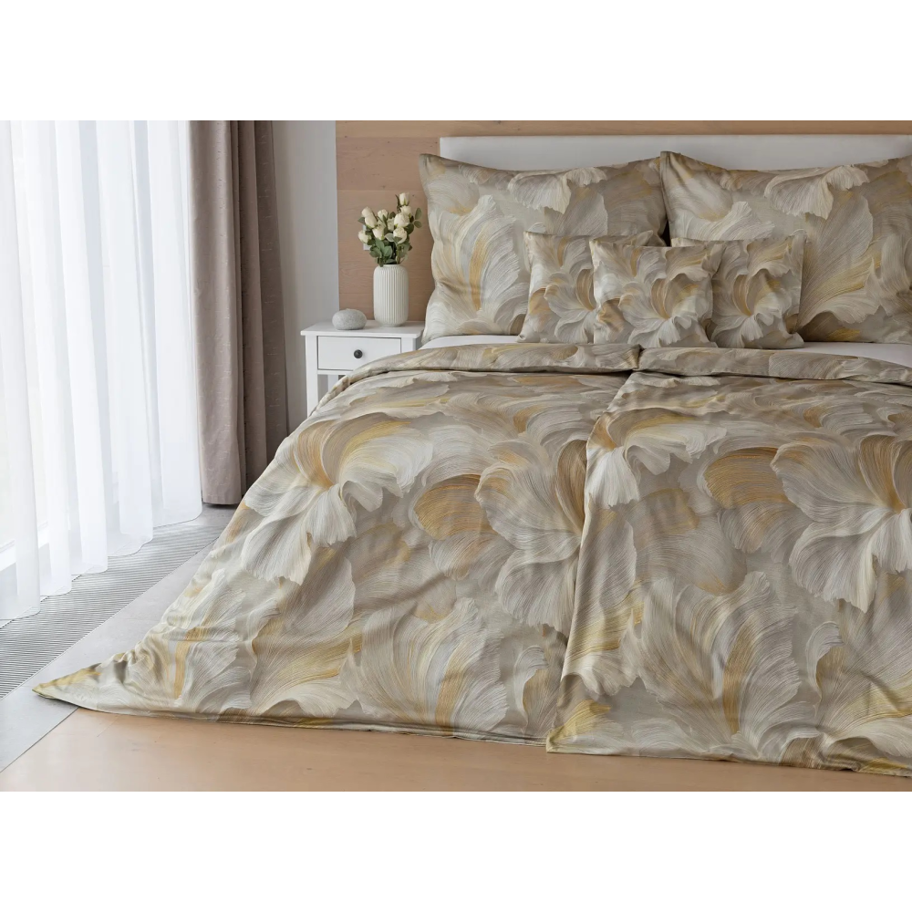 Ložní povlečení Harmonia kombinuje krémové, šedobéžové a zlatavé tóny v abstraktním květinovém motivu, který působí lehkým a vzdušným dojmem. Decentní barevnost dodává designu nadčasový charakter a umožňuje snadné sladění s různými styly interiéru. Jemný lesk bavlněného saténu podtrhuje elegantní vzhled tohoto autorského motivu.