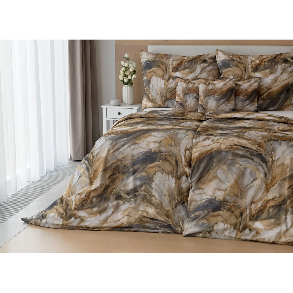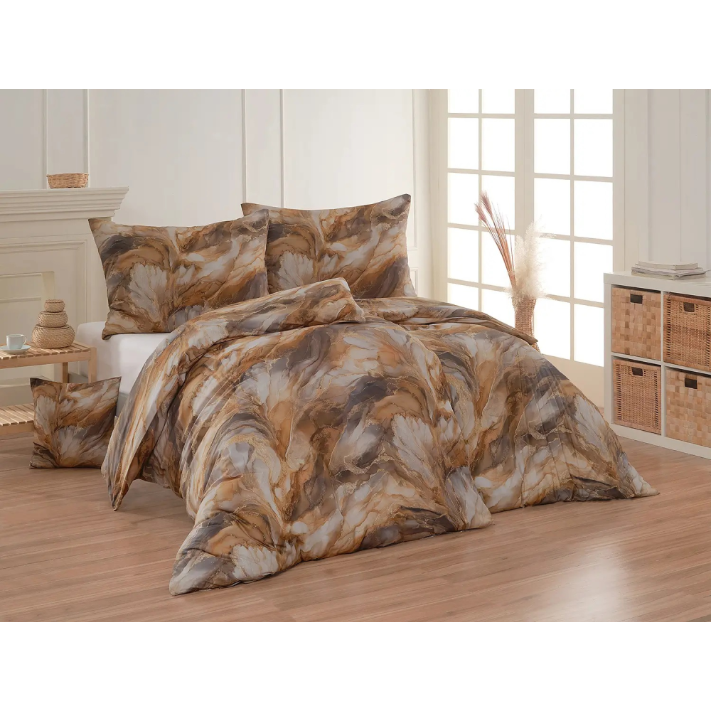 Bavlněné povlečení Zelmira inspirované strukturou přírodního kamene přináší do ložnice eleganci a originalitu. Dynamický vzor v kombinaci teplých hnědých, karamelových a šedých tónů vytváří působivý mramorový efekt. Povlečení se stane dominantním prvkem a skvěle vynikne v minimalistickém i přírodně laděném interiéru.