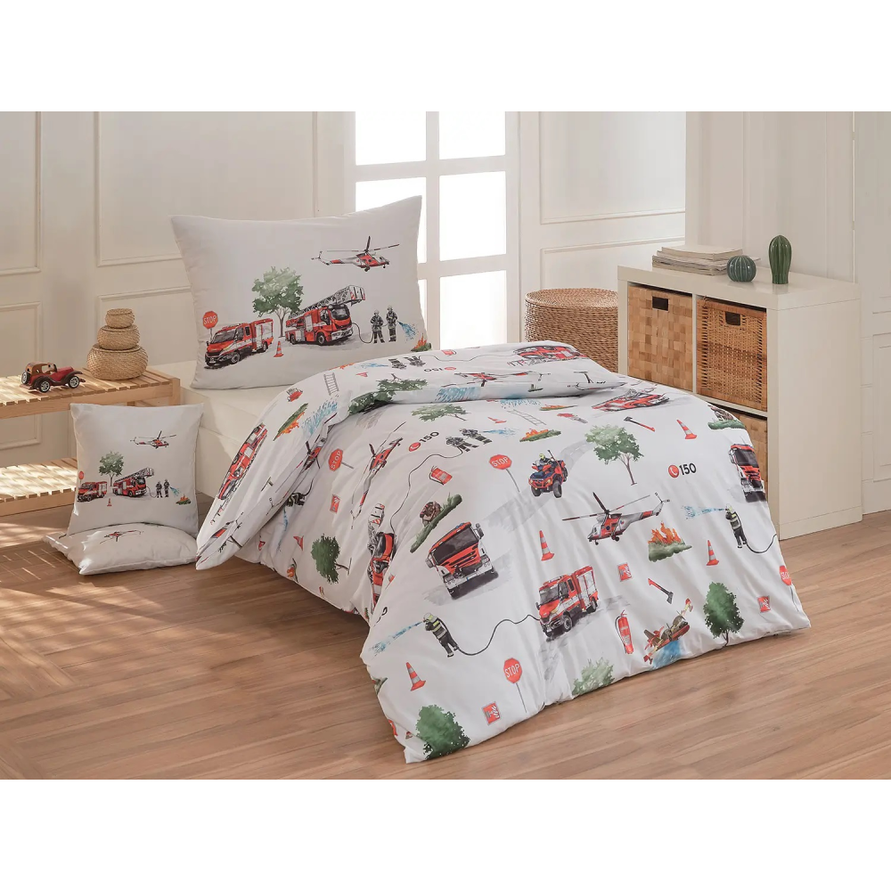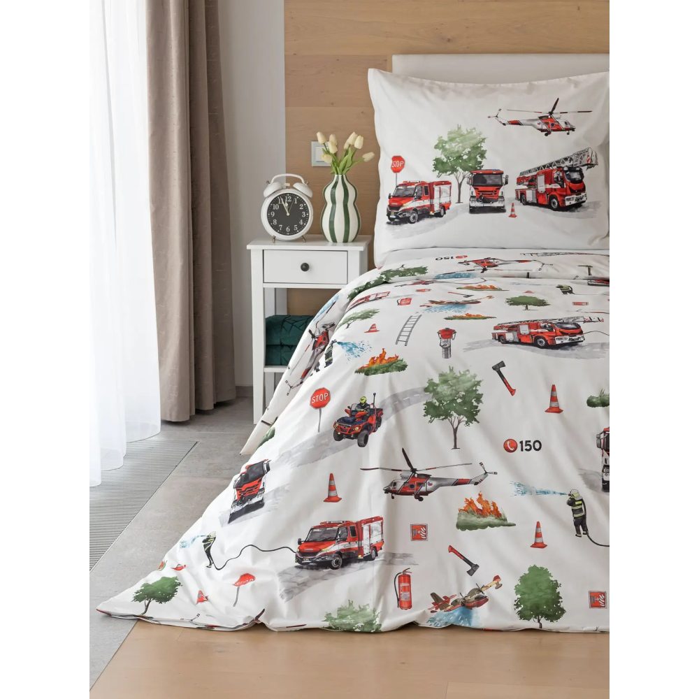 Dětské povlečení Hasiči s motivy hasičské techniky potěší všechny malé milovníky záchranářských dobrodružství. Na bílém podkladu ožívají realistické ilustrace hasičských aut, vrtulníku, čtyřkolky i požárníků v akci. Dynamický motiv doplňují dopravní značky, kužely a další detaily, které vytvářejí hravou atmosféru. Zatímco malí záchranáři sní o dobrodružstvích, o jejich spokojený spánek se postará hebká prvotřídní bavlna.