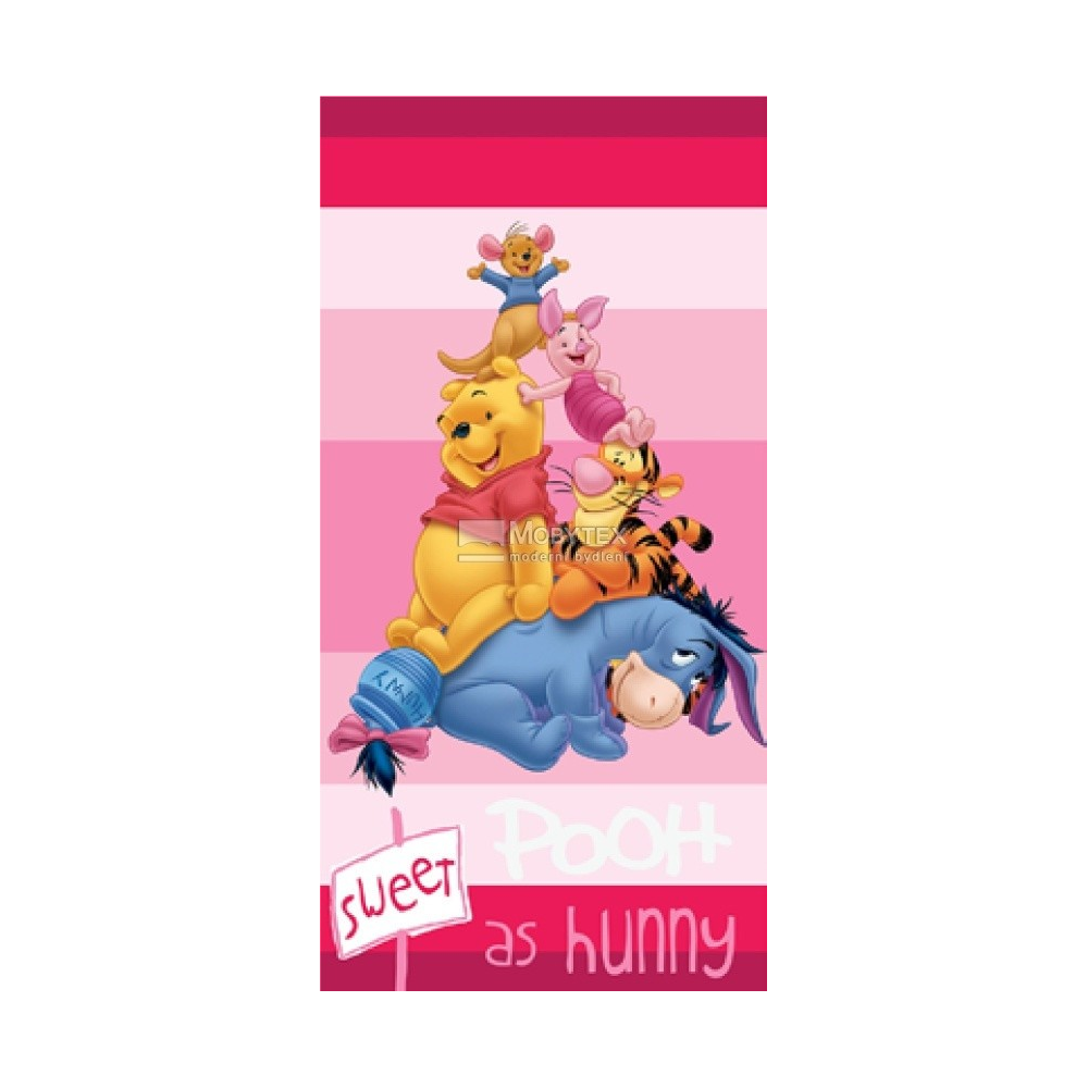 Osuška Medvídek Pú pink. Osuška je vhodná jak na domácí používání, tak i k vodě či na pláž. Osuška je vyrobena ze 100% bavlny a je velmi příjemná na omak. Doporučujeme prát na 40 °C v pracích prostředcích na jemné a barevné prádlo.