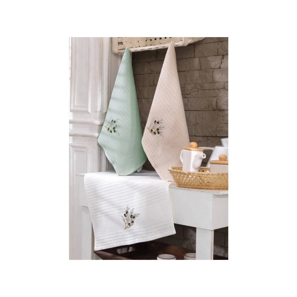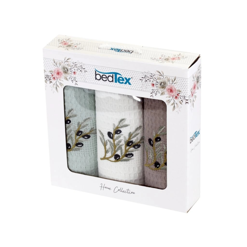 Utěrky jsou v balení ve třech barvách a to bílé, hnědé a zelenkavé s výšivkou olivových větviček