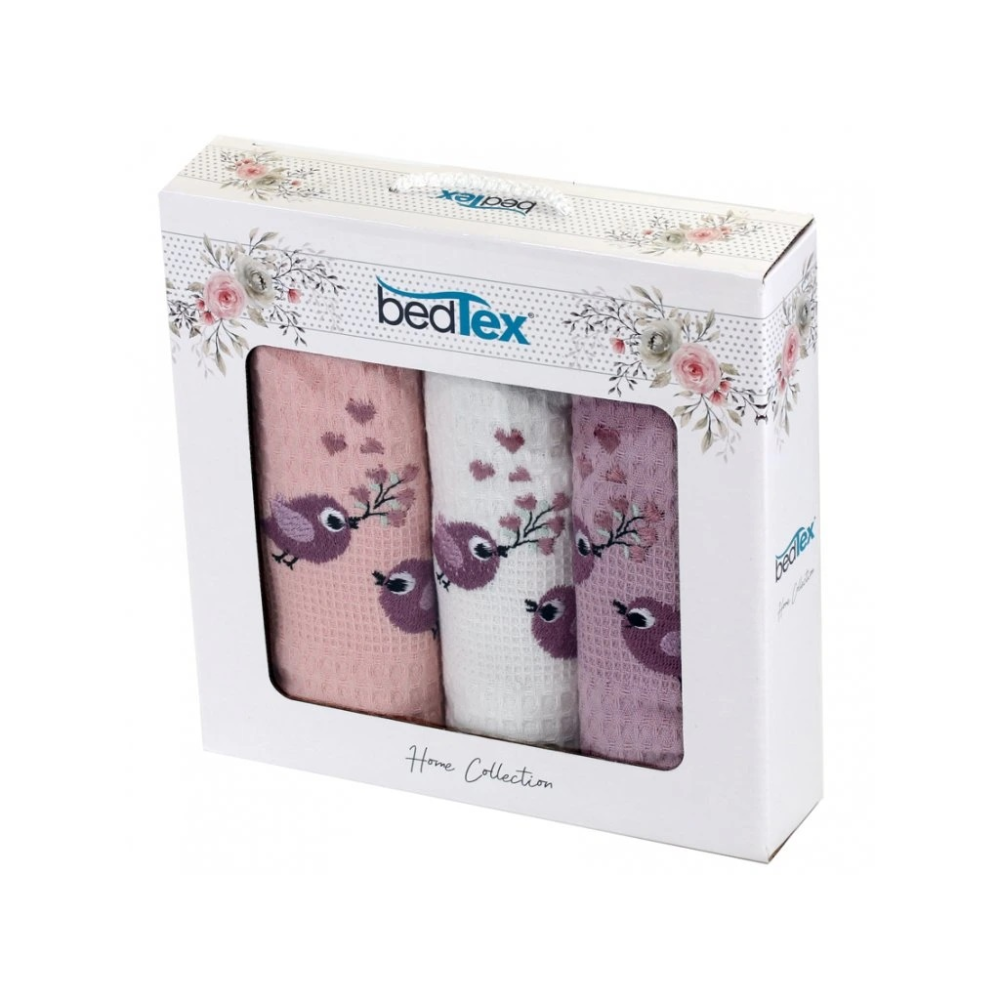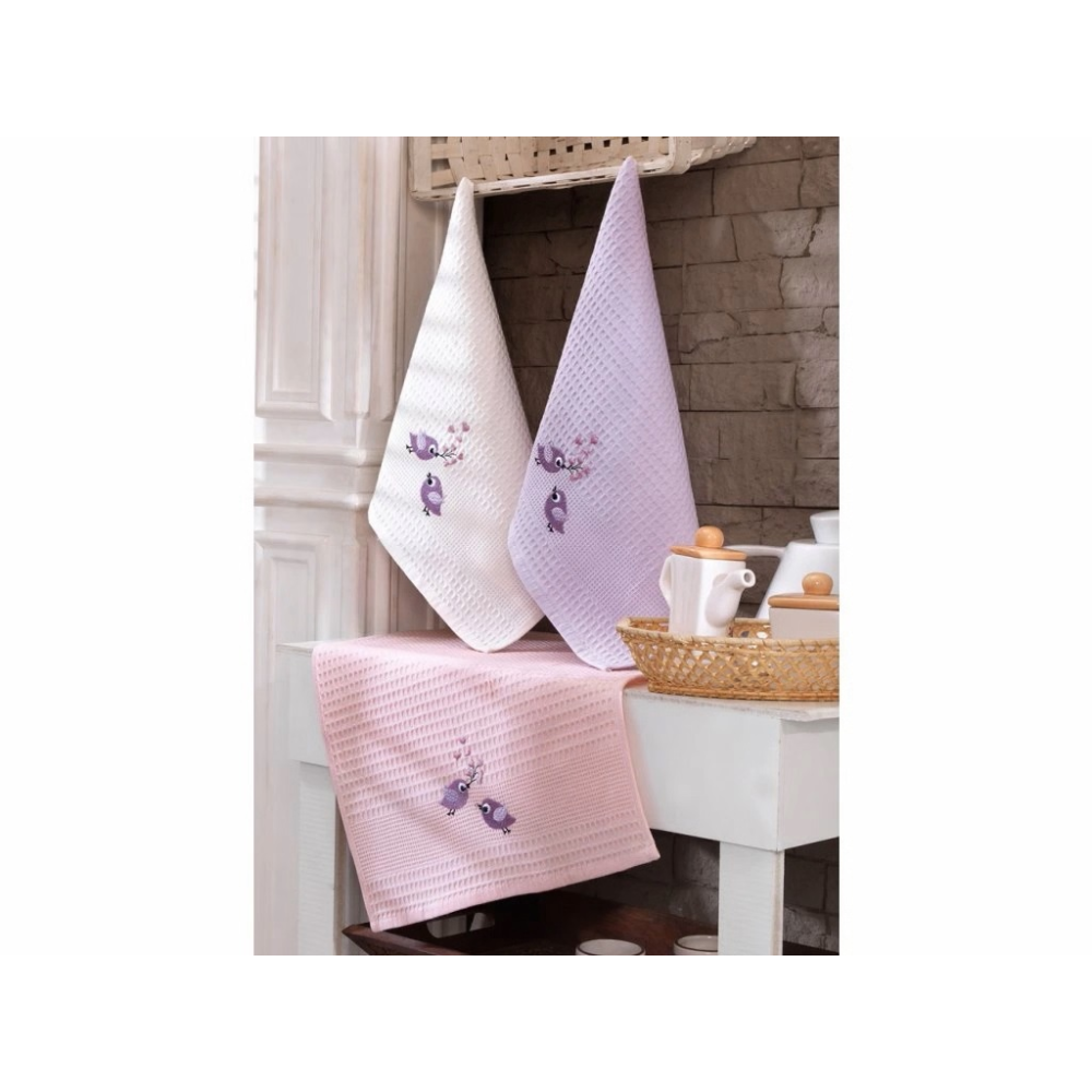 Utěrky jsou v balení ve třech barvách a to bílé, růžové a fialkové, s výšivkou malých, roztomilých ptáčků